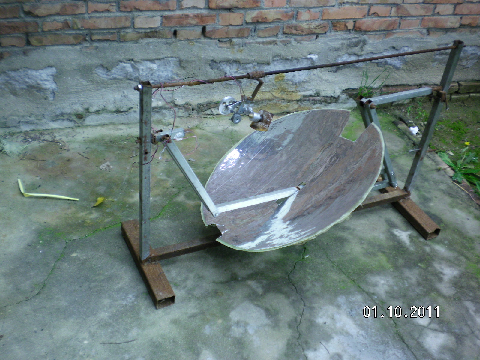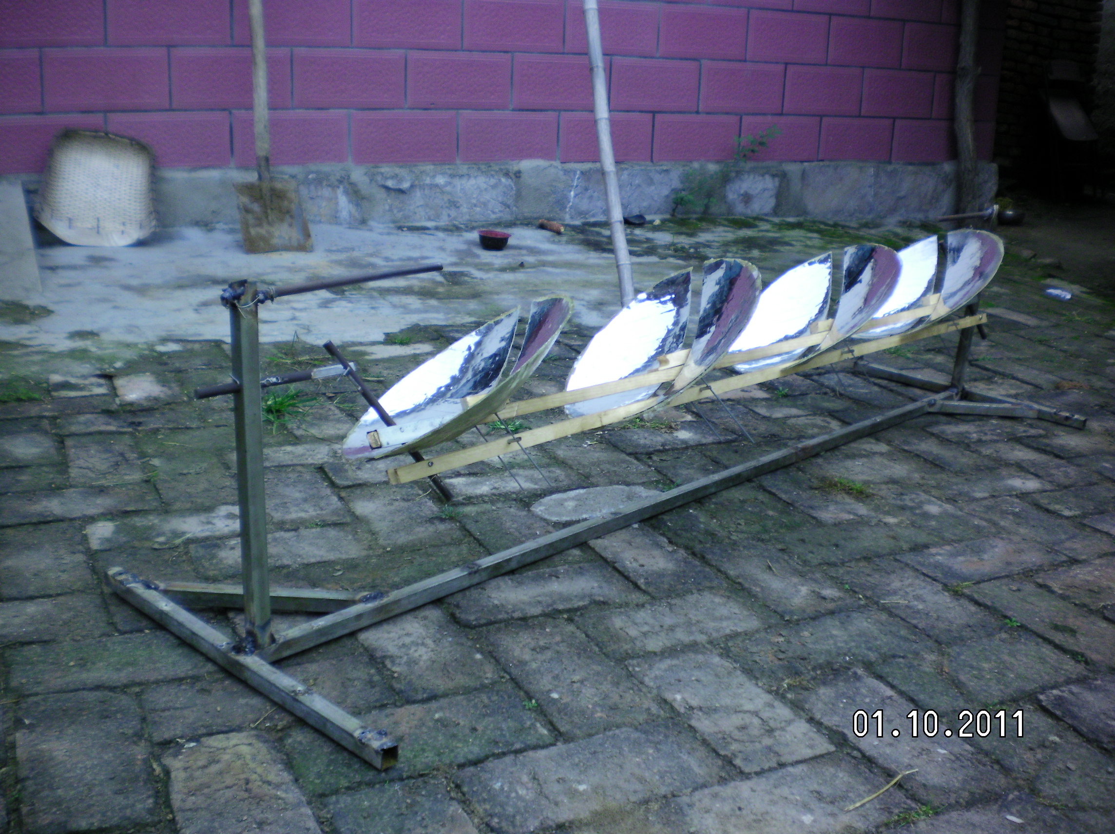 隨著全球環(huán)境惡化和日益嚴峻的能源形勢世界各國對太陽能熱發(fā)電越來越重視。現在最常用的太陽能熱發(fā)電系統(tǒng)主要有槽式、蝶式和塔式,槽式和蝶式的光熱部件必須隨聚光鏡做相應的運動,槽式各個光熱部件復雜昂貴,蝶式光熱部分只能單獨使用塔式的受熱部分出現故障很難維修這三種系統(tǒng)都有自己的缺點。基于此我設計了平行定焦太陽能聚光集熱發(fā)電系統(tǒng):主要有一對支柱.一對轉軸.一對動臂.旋轉拋物面聚光鏡.一根托桿.一根平行桿.平行連桿組成將兩支柱固定在一條直線上,兩轉軸安裝在兩支柱上兩轉軸可以左右轉動,兩動臂安裝在兩轉軸上使可以隨轉軸左右前后擺動。托桿安裝在兩動臂上,平行桿與托桿平行安裝在兩動臂上,這樣動臂.托桿.平行桿構成一個平行凹框。在旋轉拋物面鏡原點安一橫軸并切去部分旋轉拋物面鏡,在橫軸兩端垂直安裝兩根平行連桿,把旋轉拋物面鏡的橫軸安裝在托桿上。在平行桿上安裝連桿軸把平行連桿與連桿軸連接在一起。所述旋轉拋物面鏡的焦距等于托桿與轉軸之間動臂的長度。將動臂對準太陽陽光就會聚焦到固定點上在這些位置安裝光熱部件就會得到熱能用于熱發(fā)電。這種結構是雙軸定焦所以效率很高,抗風性好。這種結構可以做成很小裝在高在15-20cm的透明罩內安裝在樓頂或樓房南墻上,為人們提供開水或蒸汽。請看模型照片: