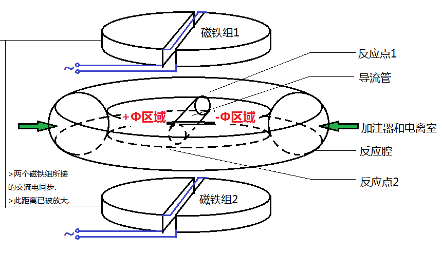 如圖, 兩組電磁鐵平行放置, 反應(yīng)腔夾于磁鐵之間. 每個(gè)電磁鐵組水平均分為兩半, 中間以狹縫隔開(kāi). 其線(xiàn)圈繞組使得在通交流電時(shí)兩半的磁場(chǎng)方向相反, 大小相同. 兩組電磁鐵通以同步高頻交流電, 于是就可以使兩組電磁鐵之間的半邊磁通量變化, 從而在反應(yīng)腔所在的位置產(chǎn)生渦旋電場(chǎng). 兩邊的渦旋電場(chǎng)在反應(yīng)腔中部橫穿的導(dǎo)流管處疊加. 導(dǎo)流管兩端自然產(chǎn)生主、副對(duì)撞點(diǎn), 即反應(yīng)點(diǎn)1和2. 反應(yīng)腔內(nèi)同時(shí)還存在水平方向同軸的環(huán)形磁場(chǎng)(此點(diǎn)與托卡馬克相同), 用于約束粒子沿環(huán)形軌跡運(yùn)動(dòng), 并在反應(yīng)點(diǎn)處收緊以壓縮等離子體.