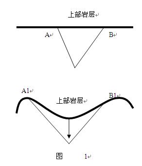 冰輒理論認(rèn)為:地殼運(yùn)動(dòng)與巖漿無(wú)關(guān),它是地殼自身結(jié)構(gòu)關(guān)系的進(jìn)一步調(diào)整,是地殼自身重力作用的結(jié)果。至于山脈的形成,我認(rèn)為同樣與地下斷裂密切相關(guān),地下斷裂是地質(zhì)活動(dòng)的結(jié)果,地下斷裂的的擴(kuò)大與發(fā)展更是地質(zhì)活動(dòng)的基本運(yùn)動(dòng)形式。隨著地下斷裂的擴(kuò)大與發(fā)展,底層斷裂區(qū)域承壓能力逐漸降低,上部巖層也因地下斷裂的擴(kuò)大,最終發(fā)生自身重力作用下的區(qū)域性沉降。如圖1所示AB、A1B1為斷裂上部的巖層,初始階段斷裂較小上部巖層AB無(wú)彎曲,隨著時(shí)間的推移斷裂逐漸增大斷裂上部巖層在重力作用下逐漸發(fā)生彎曲(如A1B1所示),這時(shí),區(qū)域性沉降的上部巖層的兩端A1、B1處相對(duì)隆起,產(chǎn)生褶皺,這就形成了山脈。