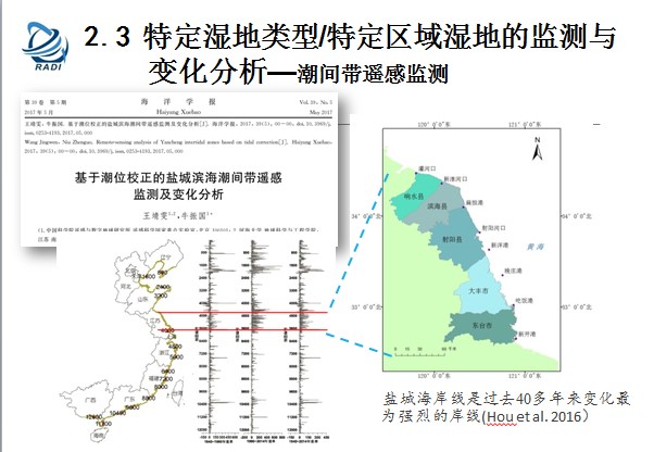 特定濕地類型的監(jiān)測(cè)與變化分析,為什么最近在做特定類型呢?我們發(fā)現(xiàn)監(jiān)測(cè)濕地變化呢,從無(wú)到有,從原來(lái)不了解,研究了之后發(fā)現(xiàn)我們很多數(shù)據(jù)不足,包括其中很多類型沒(méi)有監(jiān)測(cè)到,包括水田用其他的方法補(bǔ)充進(jìn)去了。因?yàn)楹Q鬂q潮的時(shí)候衛(wèi)星每天時(shí)間大概早上5點(diǎn)過(guò)境,但是沒(méi)法監(jiān)測(cè)潮間帶,所以我們對(duì)潮間帶做了監(jiān)測(cè)。