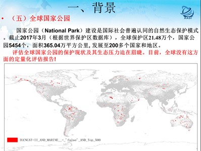 保護(hù)區(qū)評(píng)價(jià),目前開展的是全球國(guó)家公園保護(hù)現(xiàn)狀和生態(tài)壓力評(píng)估正在做工作,首先為什么要干這項(xiàng)工作,加強(qiáng)國(guó)家公園保護(hù)狀態(tài)和生態(tài)壓力定量化評(píng)估,有助于人類了解地球上最美麗的生態(tài)環(huán)境資源的性質(zhì)和數(shù)量以及人類自身對(duì)這些資源產(chǎn)生了什么的壓力,有助于提高人類關(guān)于自然保護(hù)與持續(xù)發(fā)展的科學(xué)認(rèn)識(shí)和面對(duì)生態(tài)環(huán)境退化的應(yīng)對(duì)能力。有助于提升我國(guó)在世界上生態(tài)環(huán)境保護(hù)的地位和話語(yǔ)權(quán)。有助于提升我國(guó)在全球國(guó)家公園建設(shè)、生態(tài)安全維護(hù)和“一帶一路”戰(zhàn)略布局都具有重要的參考價(jià)值。通過(guò)研究世界上最好的范例,對(duì)中國(guó)國(guó)家公園體制改革試點(diǎn)、中國(guó)國(guó)家公園建設(shè)彎道超車和中國(guó)保護(hù)區(qū)事業(yè)健康發(fā)展均具有一定的借鑒意義。