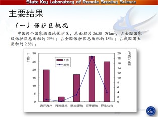 這是保護(hù)區(qū)的效果,在我結(jié)論里面按個(gè)數(shù)來(lái)看保護(hù)好的19個(gè),保護(hù)不太好是44個(gè),所占比例不太好將近一半,但是從面積來(lái)看非常不樂(lè)觀79%不太好,原因在什么地方呢?后面我們也分析了,有一個(gè)全國(guó)最大的保護(hù)區(qū),一個(gè)保護(hù)區(qū)占超過(guò)15萬(wàn)平方公里,主要是這一個(gè)保護(hù)區(qū)造成比例相差大一點(diǎn)。