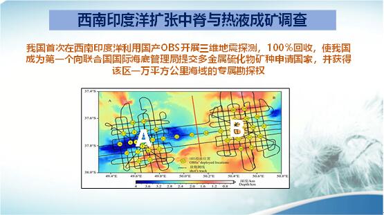 在全球的海洋中,大部分海洋為公海,有些國(guó)家已圈出自己具有礦產(chǎn)調(diào)查和開(kāi)采權(quán)的某片海域。我們國(guó)家在西南印度洋布設(shè)了“中國(guó)結(jié)”的地震臺(tái)網(wǎng),開(kāi)展三維地震觀測(cè)。并第一個(gè)向聯(lián)合國(guó)國(guó)際海洋海底管理局申請(qǐng),獲得了這一地區(qū)一萬(wàn)平方公里的多金屬硫化礦物的專(zhuān)屬開(kāi)采權(quán)。