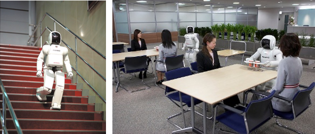 種服務(wù)機(jī)器人很多,比較有代表性的是日本的新一代仿真機(jī)器人,看看它現(xiàn)在都能干什么。這個(gè)機(jī)器人上邊是有眼睛的,還有各種各樣的傳感器。它現(xiàn)在已經(jīng)可以跑得很快,每小時(shí)跑九公里。它可以聽得懂三個(gè)人同時(shí)發(fā)的命令,能簡單對話。這個(gè)手已經(jīng)很靈巧了,能擰杯子。它可以主動繞開對面走過來的人,有的時(shí)候靠視覺,有的時(shí)候靠身上其他東西。能踢球,做手語。我們希望這樣的機(jī)器人能早點(diǎn)進(jìn)入我們的生活,但是有兩個(gè)問題沒解決,一個(gè)是電源,充滿電只能工作半個(gè)小時(shí),再一個(gè),智能還差的很多。