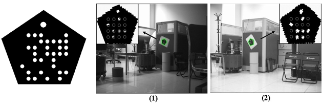 圖6  面向機(jī)器人視覺系統(tǒng)的MR-二維碼,左圖是MR-二維碼,右圖(1)和(2)是MR-二維碼在不同光照下的識別效果