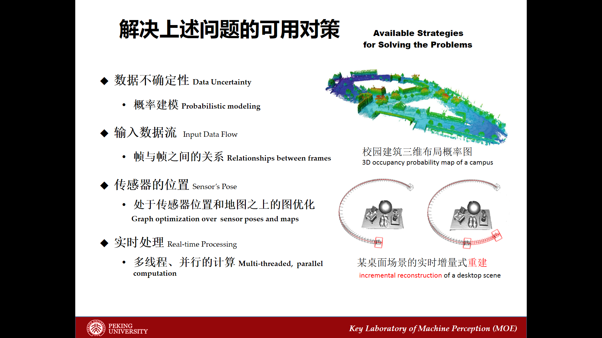 下面我再給大家具體說一下這些問題怎么解決。這里面解決了一些,從概念上非常容易想到的辦法,但是很多需要下一些功夫。數(shù)據(jù)的不確定性,我們可以用概率統(tǒng)計(jì)的方式,對數(shù)據(jù)進(jìn)行建模。數(shù)據(jù)流怎么辦?能不能很好地利用數(shù)據(jù)之間的時(shí)間的一貫性,另外用傳感器的姿態(tài)做定位,像更好的一些優(yōu)化的東西,能不能幫助我們解決優(yōu)化的問題。像實(shí)時(shí)處理,我們其他一些更好的節(jié)省計(jì)算量的方法可能要開發(fā)出來。