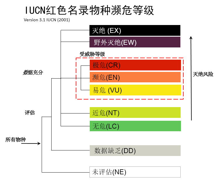 IUCN自20世紀(jì)60年代成立之日起,就設(shè)立了物種生存委員會(huì)(SSC),開始編制和印刷《IUCN瀕危物種紅皮書》,后來隨著評(píng)估物種的增加,印刷版逐步發(fā)展為網(wǎng)絡(luò)版的《IUCN瀕危物種紅色名錄》,定期編制發(fā)布。IUCN/SSC研究制定了《IUCN物種紅色名錄瀕危等級(jí)和標(biāo)準(zhǔn)》,根據(jù)物種的種群數(shù)量和分布情況等,評(píng)估其生存狀況,確定其瀕危等級(jí)。IUCN瀕危物種等級(jí)標(biāo)準(zhǔn)分為“有評(píng)估數(shù)據(jù)”和“數(shù)據(jù)缺乏”兩類,“有數(shù)據(jù)評(píng)估”中又分為“滅絕”、“野外滅絕”、“區(qū)域滅絕”、“極危”、“瀕危”、“易?!薄ⅰ敖!焙汀盁o危”等8個(gè)級(jí)別,從“無危”到“極?!保瑴缃^風(fēng)險(xiǎn)逐步上升,瀕危等級(jí)逐步增加。瀕危等級(jí)標(biāo)準(zhǔn)有5個(gè)指標(biāo),分別是種群下降、有限地理分布區(qū)、下降小種群、非常小或非常有限的種群、以及模型模擬等量化分析,根據(jù)這些指標(biāo)的數(shù)量閾值,來評(píng)估物種的瀕危等級(jí)。
