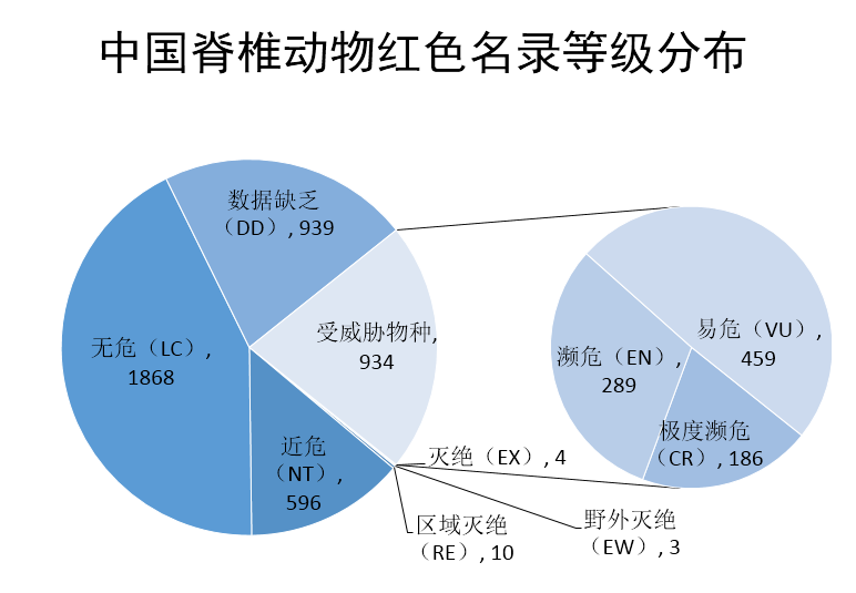 2015年完成的《中國生物多樣性紅色名錄-脊椎動(dòng)物卷》,共評(píng)估了中國4357種脊椎動(dòng)物,包括673種哺乳類,1372種鳥類,461種爬行類,408種兩棲類,1443種淡水魚類。其中939種數(shù)據(jù)缺乏,1868種無危,596種近危,受威脅的物種共934種。在934種受威脅物種當(dāng)中,易危459種,瀕危289種,極度瀕危186種。受威脅的原因分析中,過度利用、生境喪失和人類干擾是最主要的威脅因子。