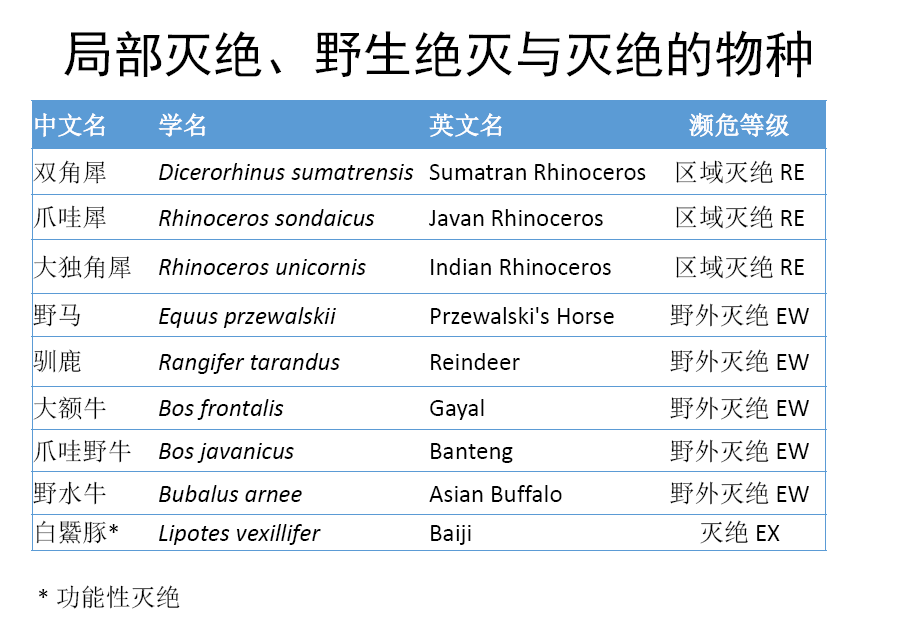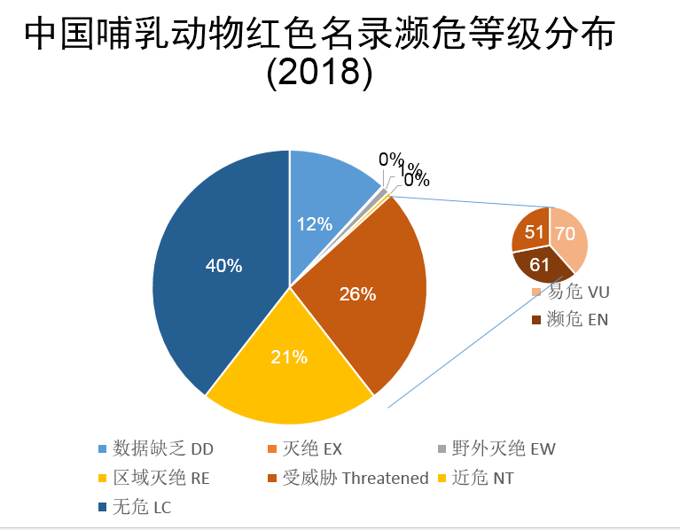 此外,我們對中國哺乳動(dòng)物多樣性進(jìn)行編目,分別于2015年和2017年完成了第一版和第二版,第一版中,我們收錄了673種哺乳動(dòng)物,第二版中我們刪除了一些不存在的物種如倭巖羊,并增添了一些物種,主要是分布在藏南的一些物種,共收錄了693種哺乳動(dòng)物,使得我國的哺乳動(dòng)物總數(shù)位列全球首位。2015年發(fā)布《中國生物多樣性紅色名錄-脊椎動(dòng)物卷》后,2018年又對該紅色名錄等級(jí)進(jìn)行了更新,哺乳動(dòng)物的情況來看,最新的評(píng)估結(jié)果中,受威脅的物種占26%、近危21%,無危40%,數(shù)據(jù)缺乏12%,其中有多個(gè)物種已經(jīng)區(qū)域滅絕、野外滅絕或功能性滅絕。部分中國特有的哺乳動(dòng)物,中國生物多樣性紅色名錄和IUCN紅色名錄的評(píng)估結(jié)果,由于評(píng)估信息的不同,結(jié)果也有所不同,如白鱀豚、長江江豚等;還有一些哺乳動(dòng)物由于并非中國特有,所以中國生物多樣性紅色名錄和IUCN紅色名錄評(píng)估等級(jí)有所不同,如野馬、賽加羚羊、麋鹿、蒙原羚、河貍等。