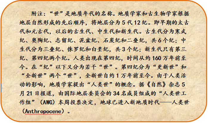 在2000年的一個(gè)國際會(huì)議上,1995年諾貝爾化學(xué)獎(jiǎng)得主保羅-克魯岑提出,當(dāng)今人類活動(dòng)對(duì)自然環(huán)境的影響已經(jīng)超過了自然狀態(tài)的變化,應(yīng)該定義一個(gè)新的地質(zhì)時(shí)代,叫人類世。我國科學(xué)家劉東生院士參加了此會(huì),回國后就極力推薦這個(gè)詞。