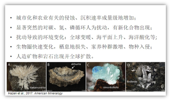 國際地層委員會(huì)的人類世工作組工作了10年,總結(jié)了一些現(xiàn)象,如城市化和農(nóng)業(yè)的侵蝕、沉積速率成量級(jí)地增加,顯著而突然的對(duì)碳、氮、磷循環(huán)的人為擾動(dòng),產(chǎn)生一些新的化合物,使得生物圈出現(xiàn)快速變化、棲息地的損失帶來植物多樣性的降低、馴化生物種群大規(guī)模增加,人類的遷徙活動(dòng)等等。